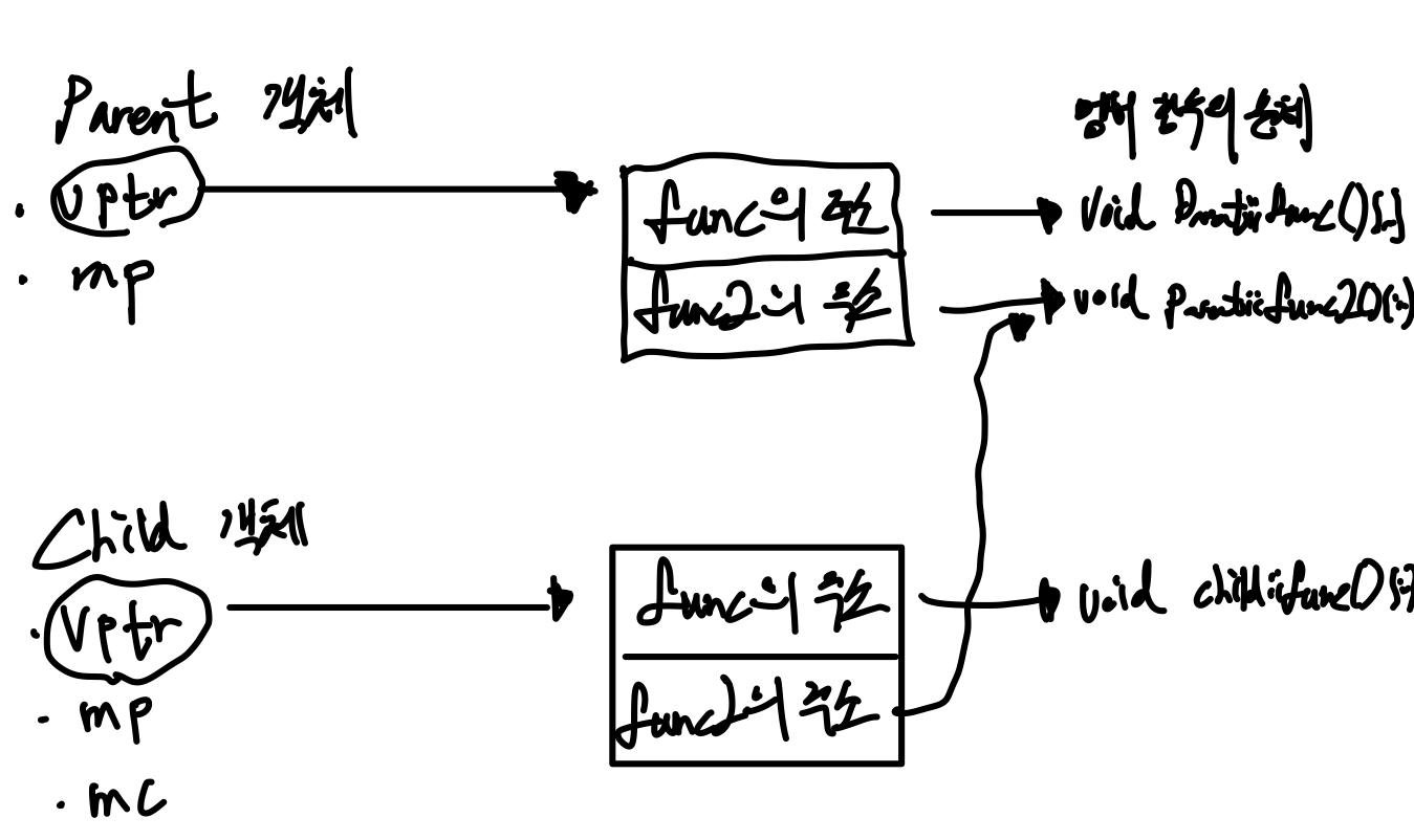 사실상 우리가 명시적으로 적지는 않았지 가상 함수가 정의가 된다면 각 객체 마다 가상 함수 테이블(vtable)을 가리키는 포인터(vptr)을 가지고 있게 된다.